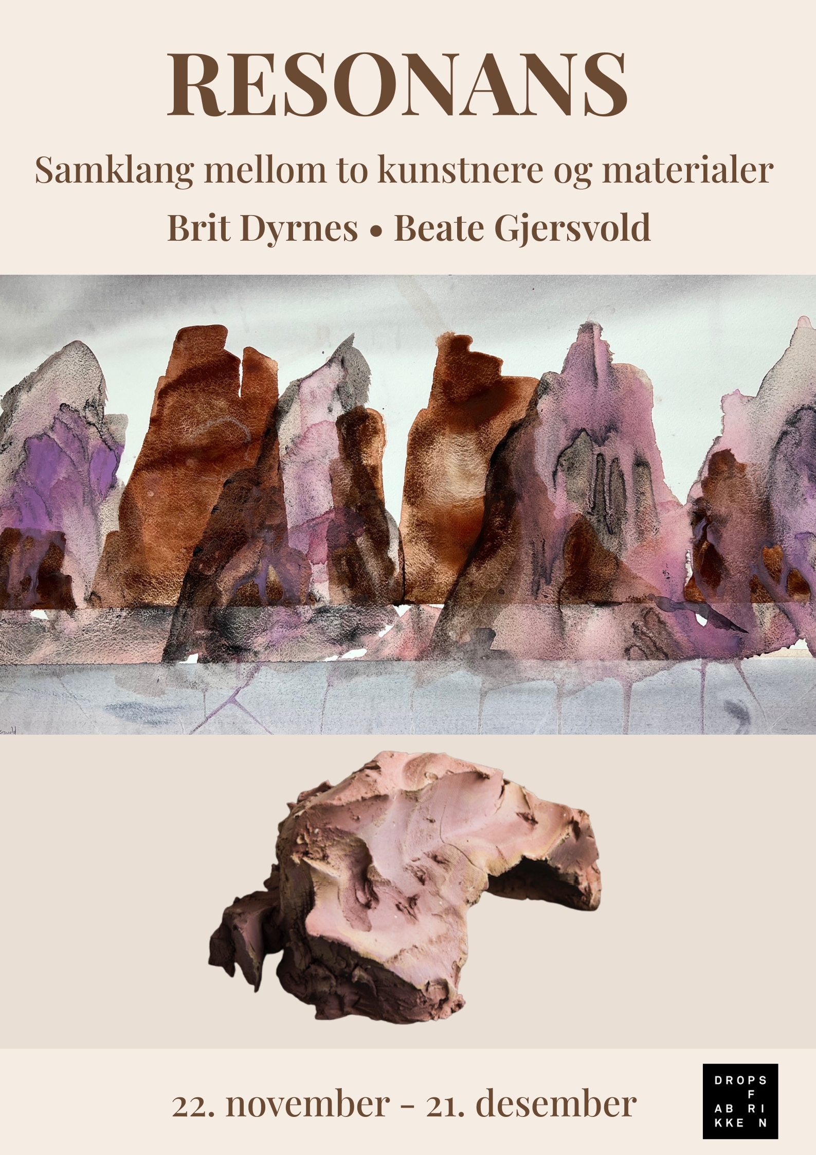 I utstillingen Resonans – samklang mellom to kunstnere og materialer undersøker Brit Dyrnes og Beate Gjersvold materialenes potensial, og hvordan leire, mineraler og bergarter – formet av geologiske prosesser gjennom tid – kan inngå i nye skapende sammenhenger. Gjennom sitt arbeid synliggjør de forbindelsen mellom naturens formgivende krefter og menneskets kunstneriske bearbeiding.